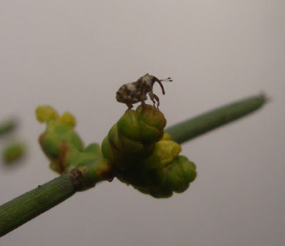 Pie femenino de efedra (Ephedra fragilis subsp. fragilis) en Rivas-Vaciamadrid, Madrid (Central Spain) con detalles de sus ramas y del curculiónido (nota: la micro-imagen del insecto está tomada en una ramita de un pie masculino),